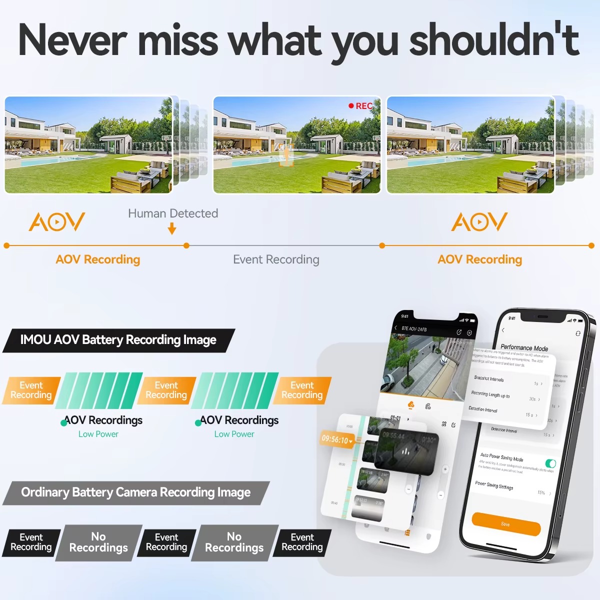 - Always On Video (AOV) tehnologija – snimanje jedne sličice svake 2 sekunde radi uštede energije, a pri detekciji prelazi na 25 fps za detaljan prikaz događaja.