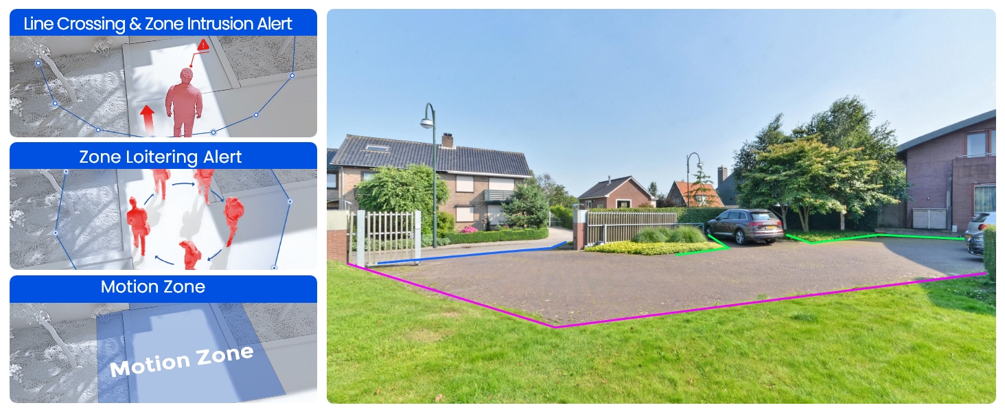 - Perimetarska zaštita: linijsko prelaženje, upad u zonu, zadržavanje u zoni za naprednu vanjsku sigurnost.