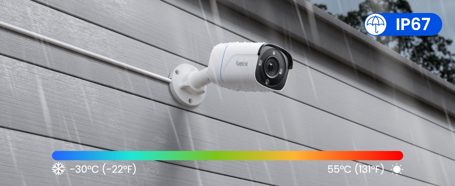 Kućište kamere izrađeno je od metala i ima IP67 certifikat, što znači potpunu zaštitu od prašine i vode u teškim vremenskim uvjetima. Kamera pouzdano radi na temperaturama od −30°C do +55°C i pri vlažnosti od 10% do 90%, što je čini prikladnom za većinu klimatskih okruženja.