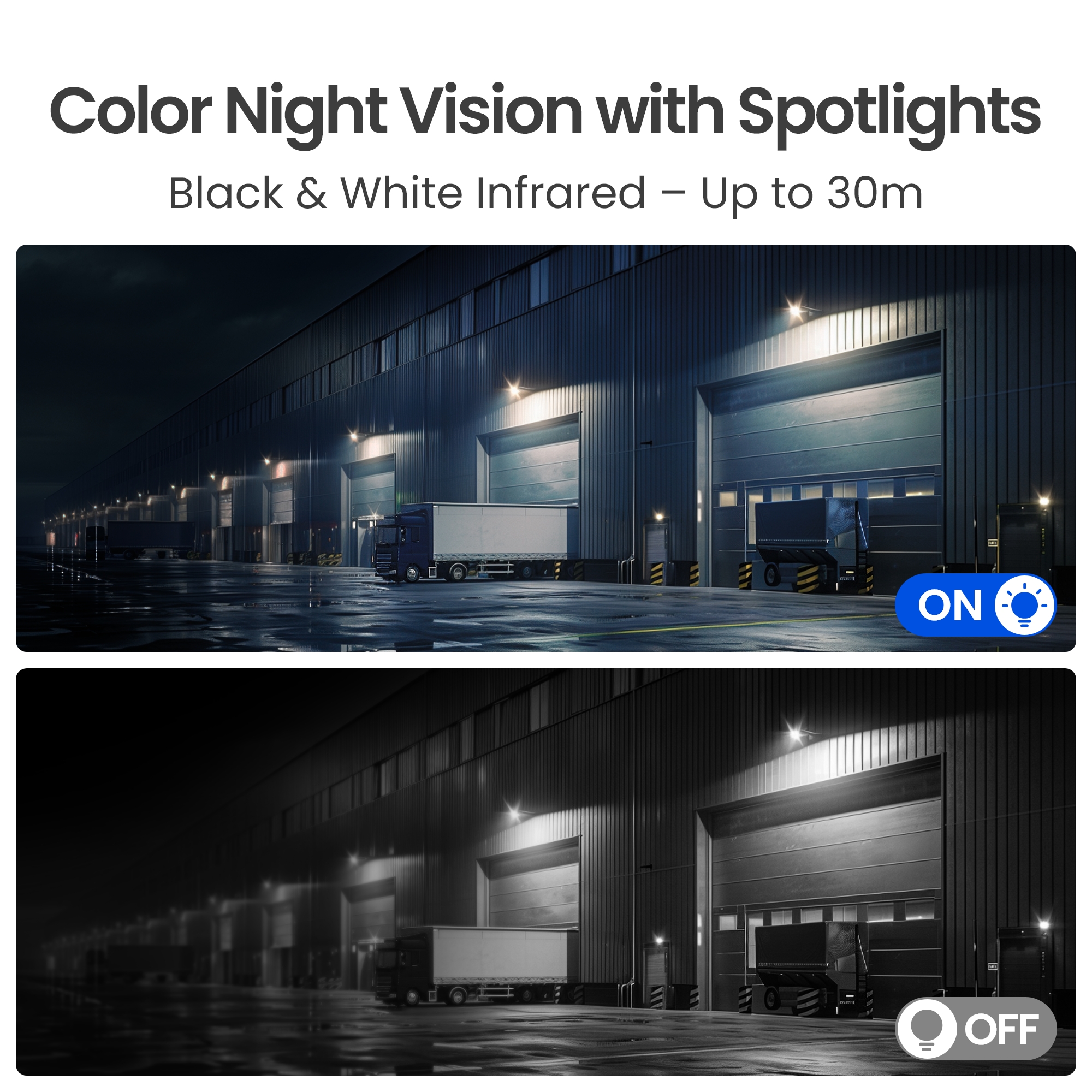 Kombinacija infracrvenih LED‑ova i snažnog reflektora daje fleksibilne mogućnosti nadzora po noći. U standardnom IR načinu kamera pruža crno‑bijeli noćni vid do 30 metara, dok aktivirani reflektor omogućuje pun kolor noćni vid i bolju identifikaciju boja i detalja.